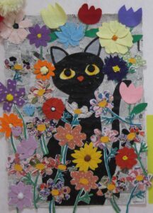 こちらの作品は、昭和の懐かしい故郷を貼り絵で作成しています。茅葺屋根は今では貴重な風景ですね。