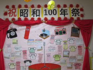 去る11月22日に通所リハビリテーションでは「昭和100年祭」と題して、昭和にちなんだ作品の展示会を行いました。現在は令和7年ですが、昭和のまま数えると丁度100年になる年だったんですね~(*’▽’)